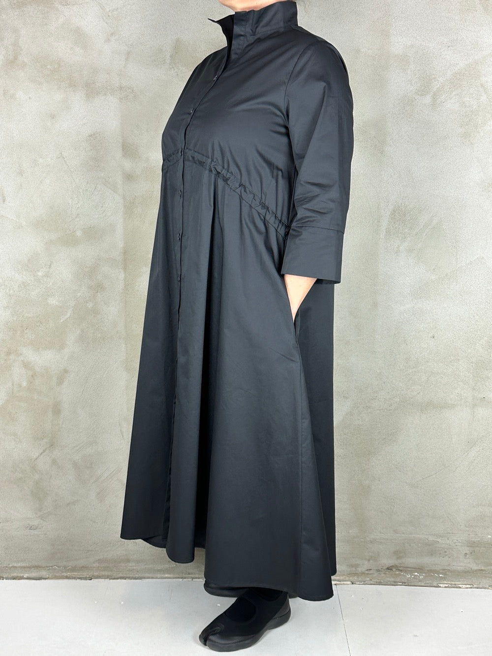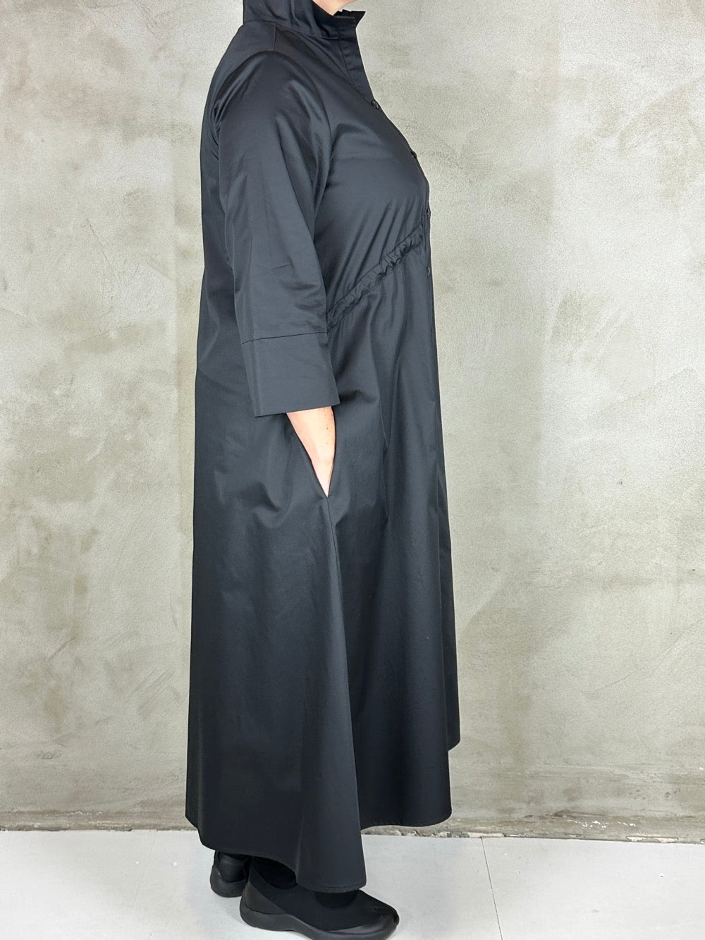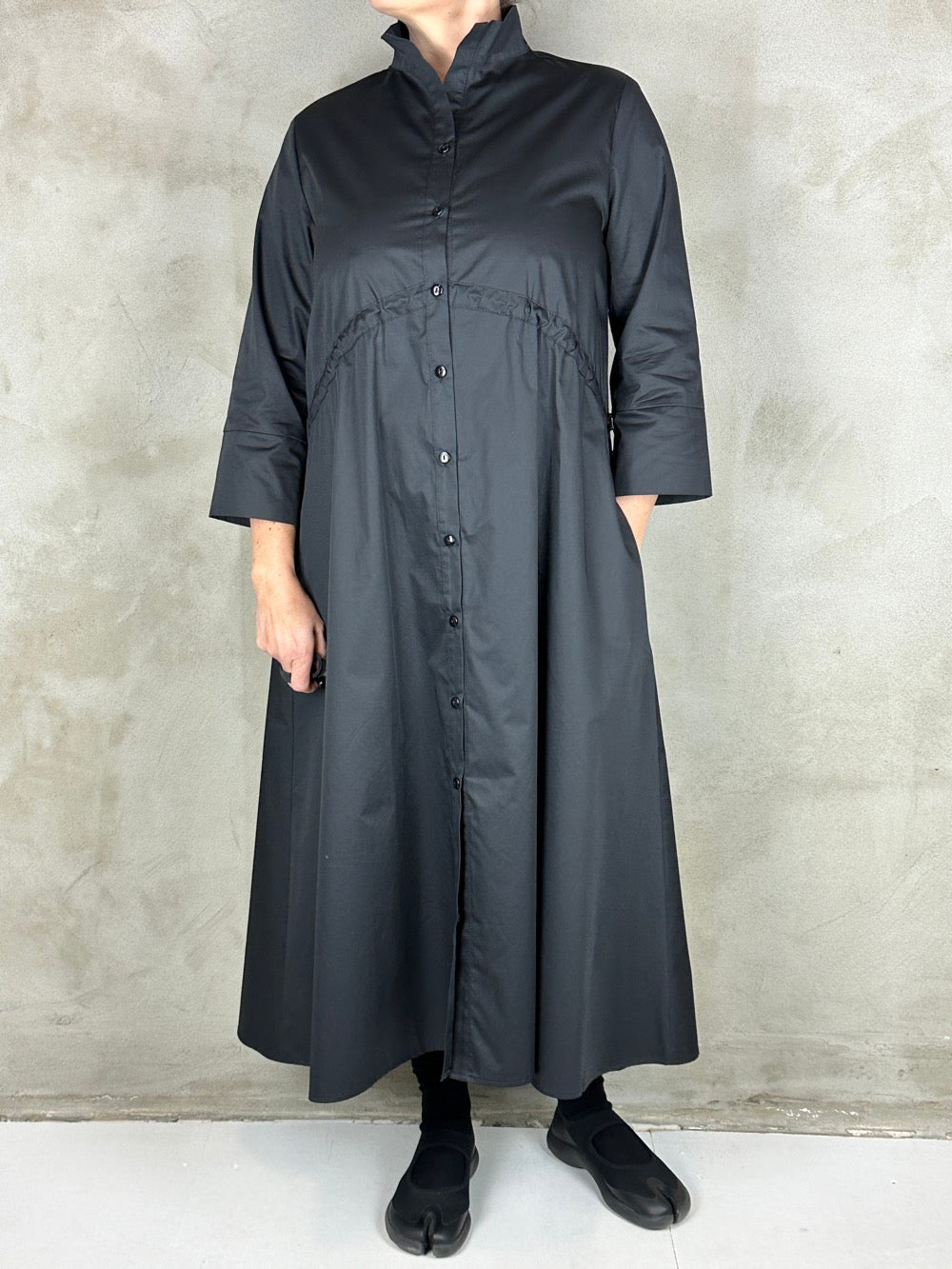 Flot skjortekjole med regulerbar effekt under barmen. Kjolen har en flot rejst krave 3/4 ærmer og lommer i siden. Den er lavet i en lækker bomuld.