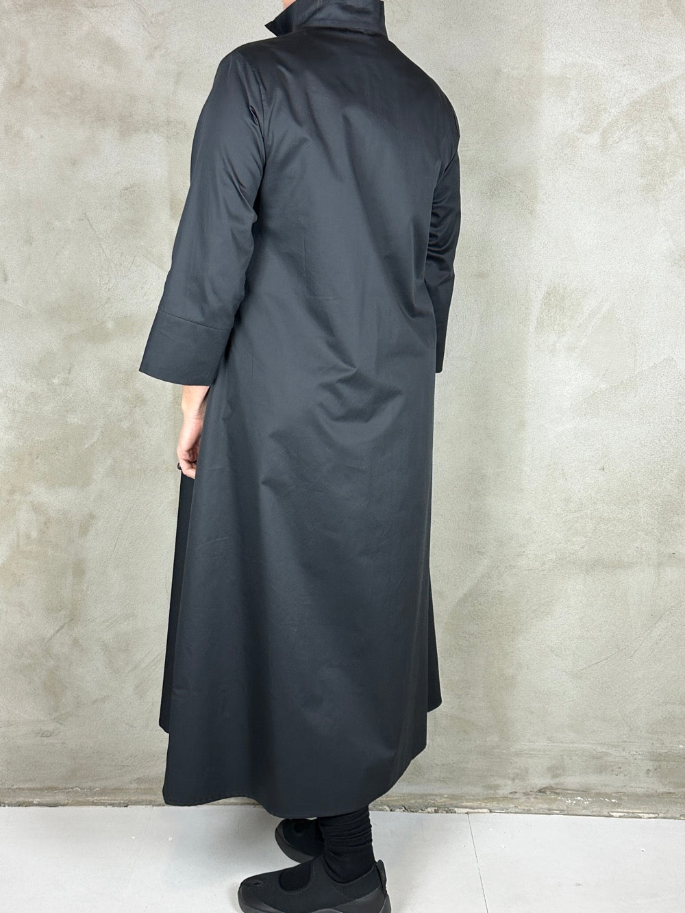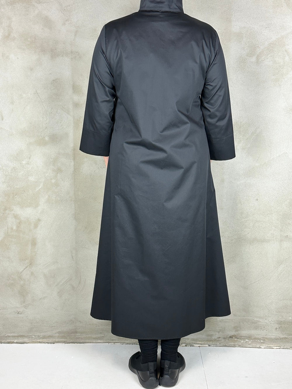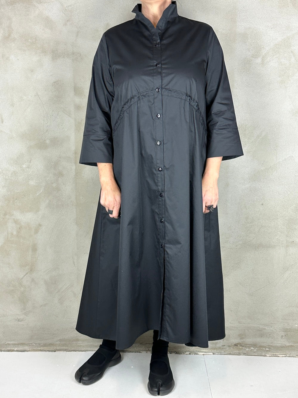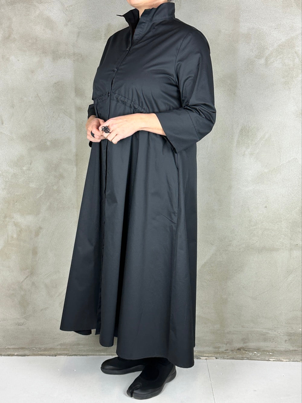 Flot skjortekjole med regulerbar effekt under barmen. Kjolen har en flot rejst krave 3/4 ærmer og lommer i siden. Den er lavet i en lækker bomuld.