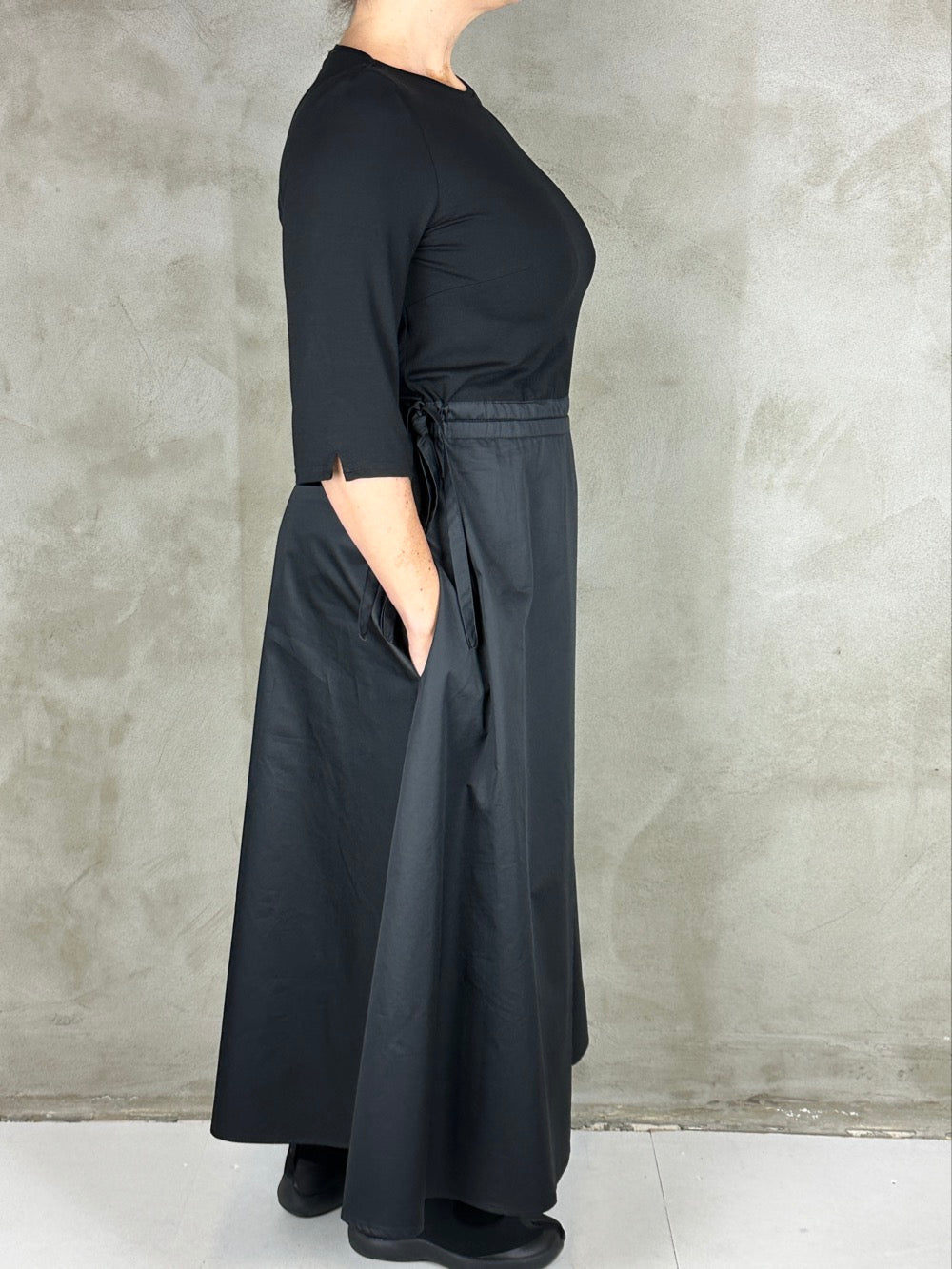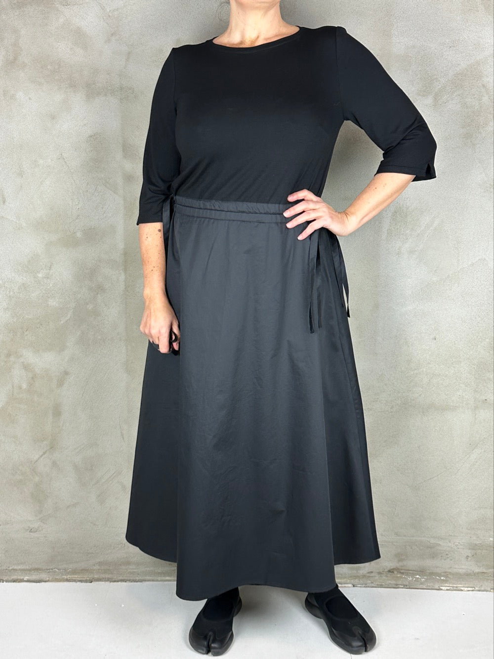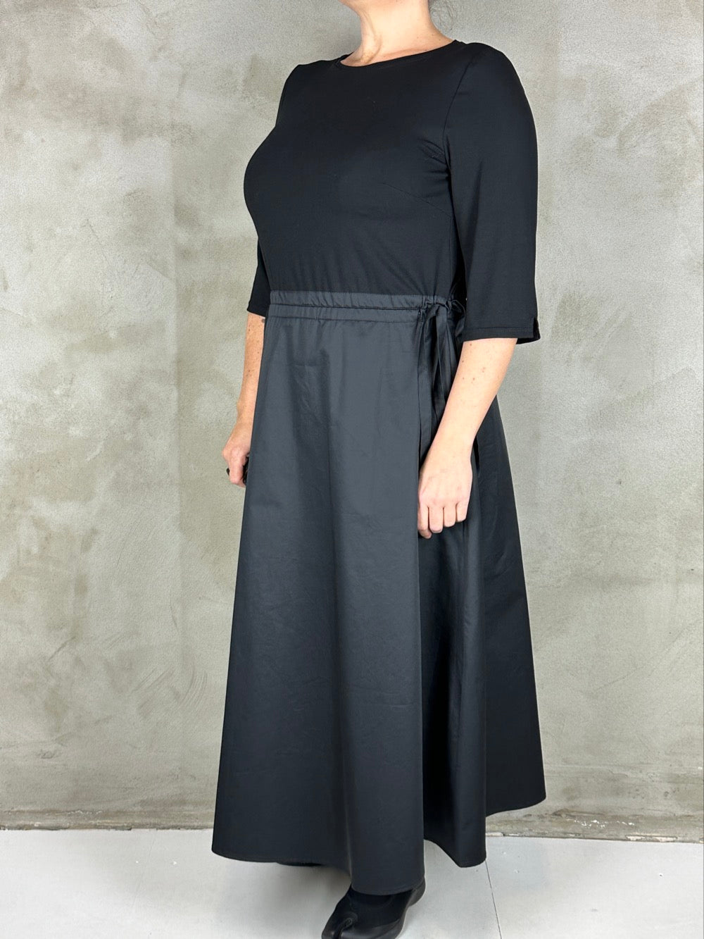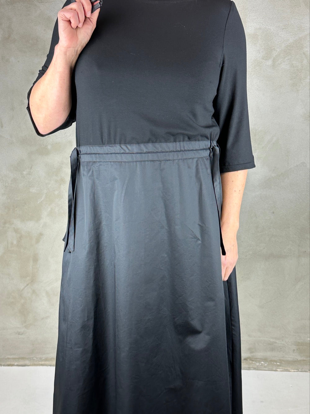 Skøn kjole som minder om et todelt sæt. Overdelen er en blød viscose med boatneck og 3/4 ærmer. Og underdelen er en lækker fast bomuldspoplin med lommer i siden. Kjolen kan trækkes ind i siden så man kan markere taljen som man ønsker.
