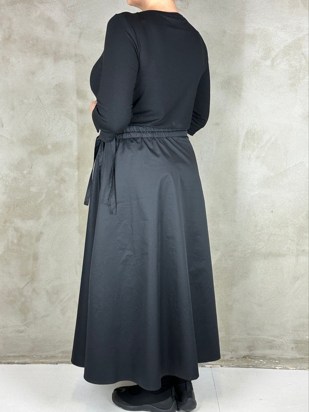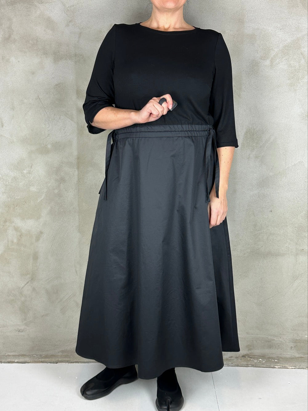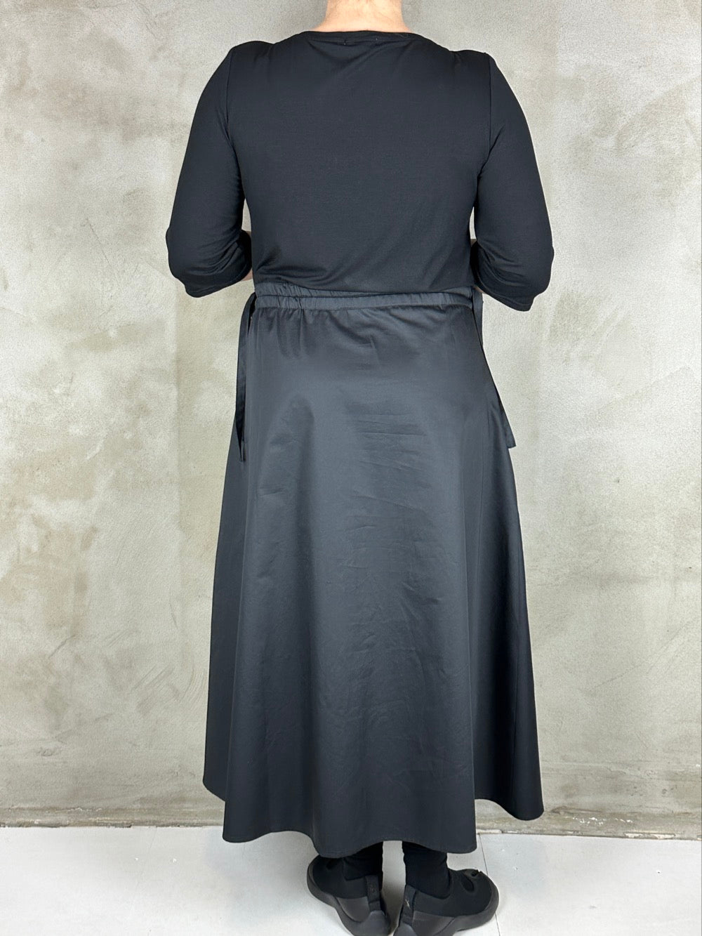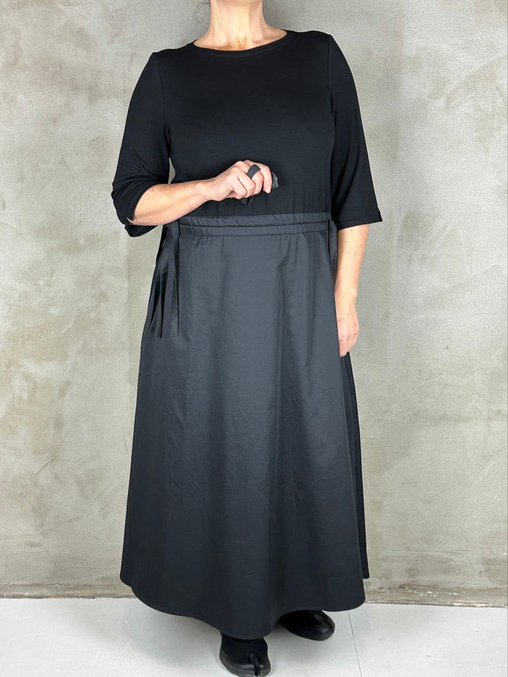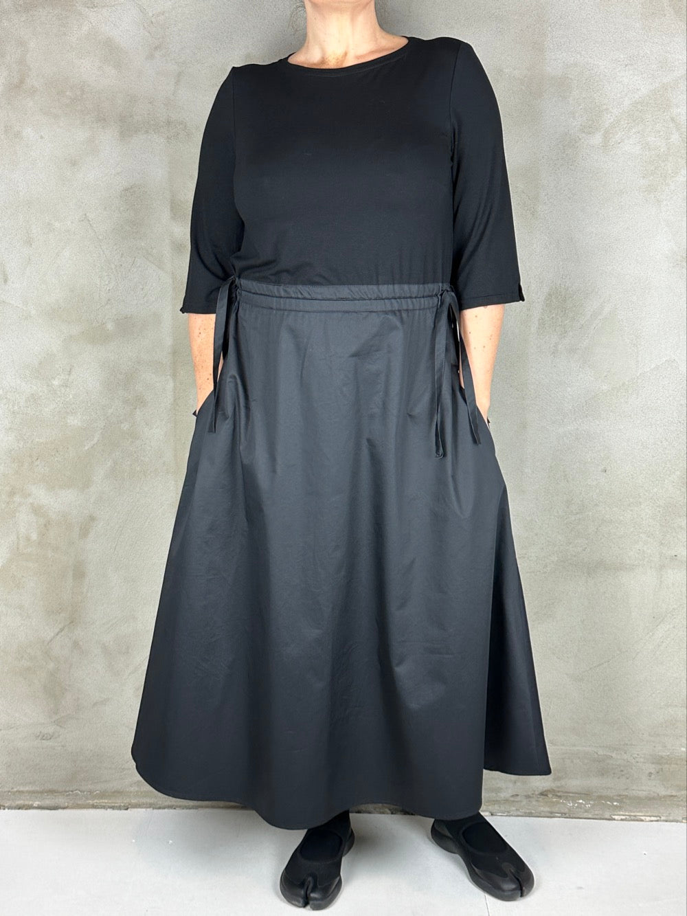 Skøn kjole som minder om et todelt sæt. Overdelen er en blød viscose med boatneck og 3/4 ærmer. Og underdelen er en lækker fast bomuldspoplin med lommer i siden. Kjolen kan trækkes ind i siden så man kan markere taljen som man ønsker.