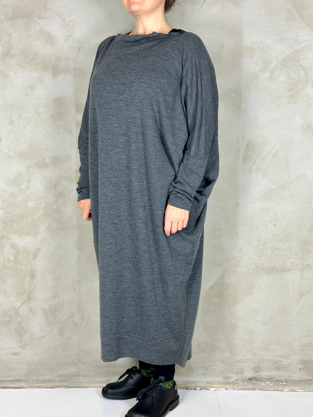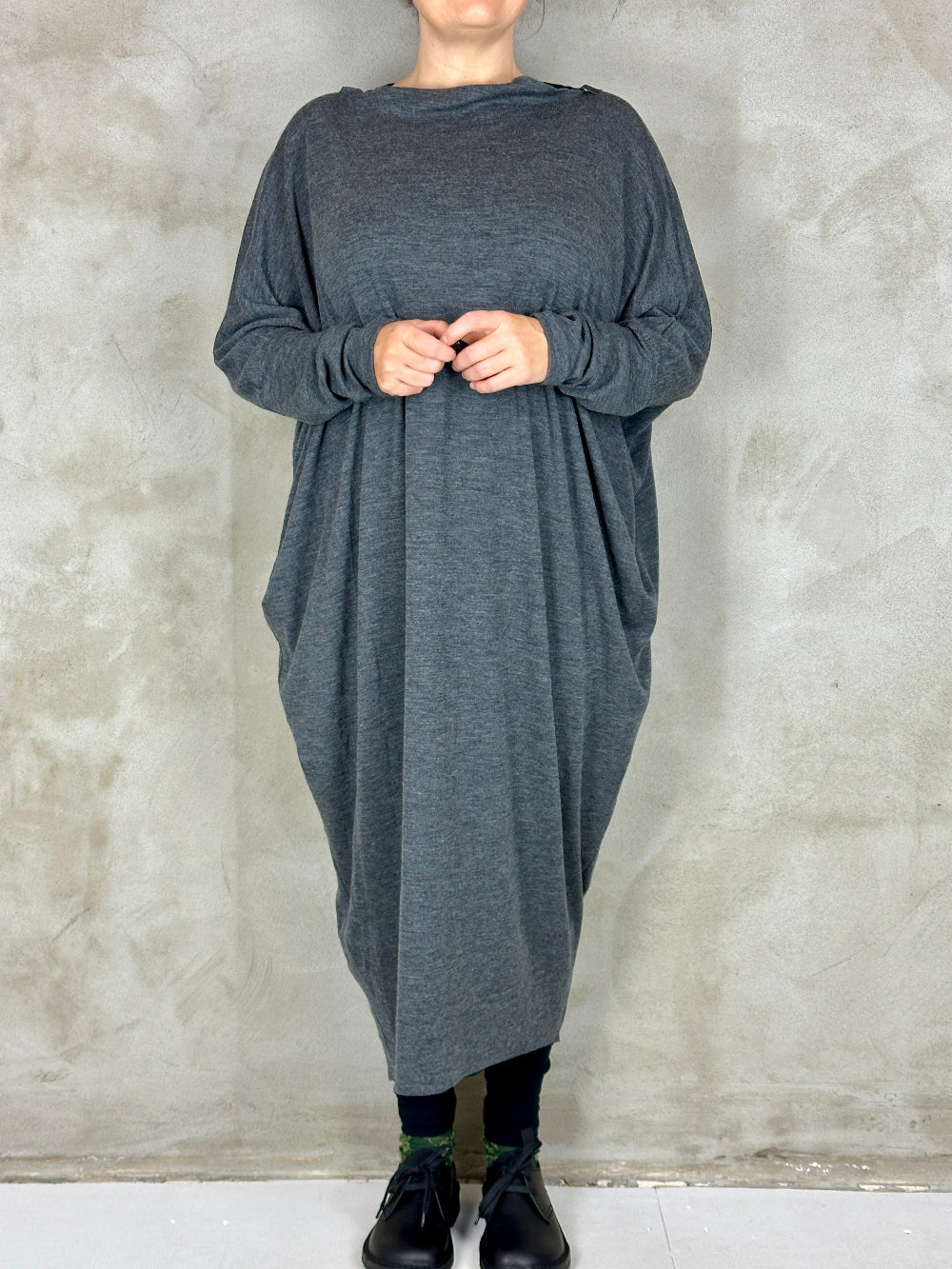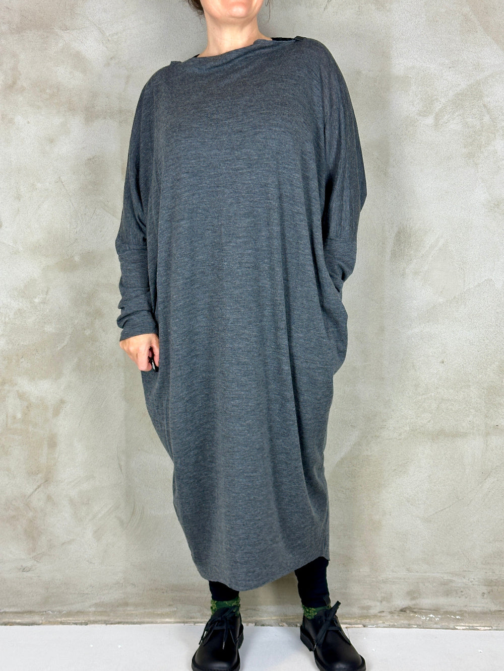 Fantastisk kjole i lækker tynd uld. Kjolen har en flot flagermus silhuet som draperer flot i siderne hvor der er gode lommer. Halsudskæringen er lige med et lille fald og afsluttes med Liselotte Hornstrups genkendelige læderdetalje. En yndlings kjole for mange, mig selv inklusiv, da den er minimalistisk med et twist, i en kvalitet som altid er skøn. Dette er en kjole man bare flytter ind i!