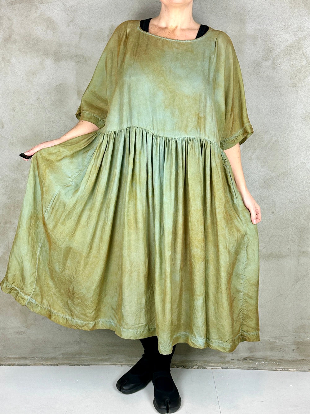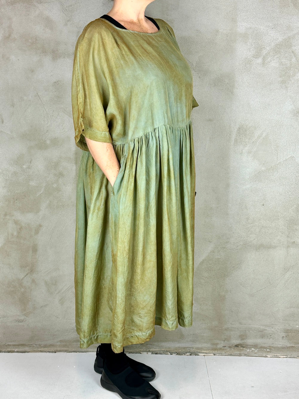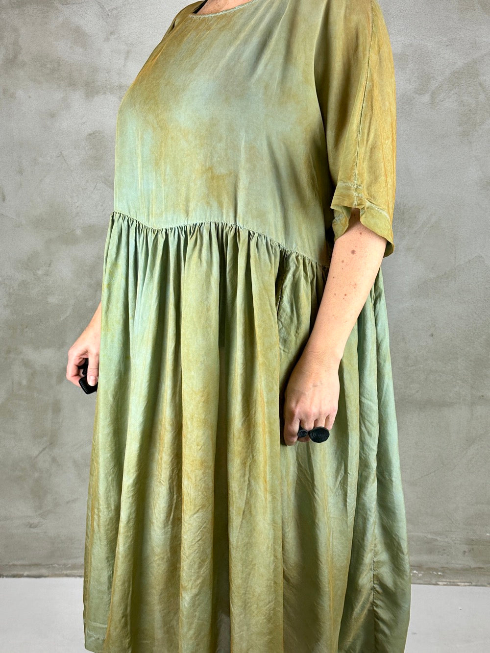 Oversize kjole med flot udskæring og perfekte ærmer. Kjolen har lommer og en længde som er god både med bare ben eller med et par leggings under. Det smukke stof changerer smukt i en bund af lys grøn med en orange overflade, hvilket også resulterer at alle kjoler er forskellige.