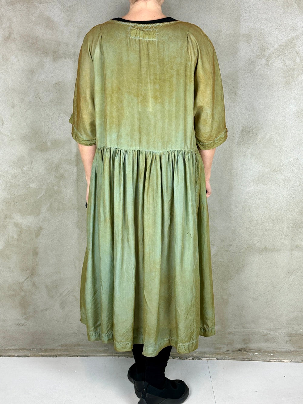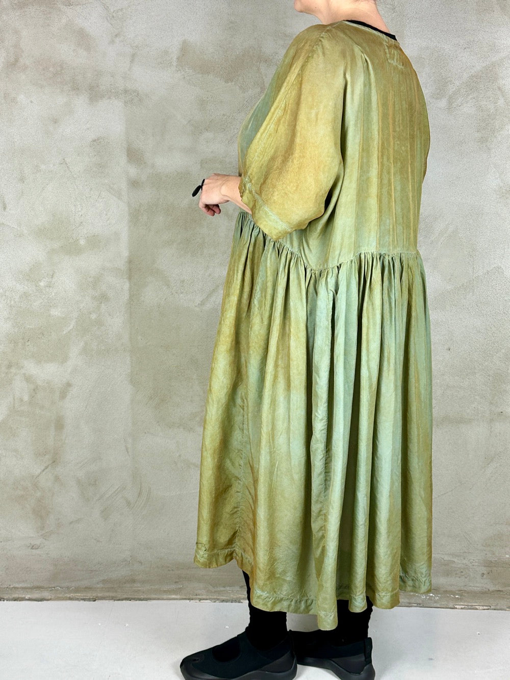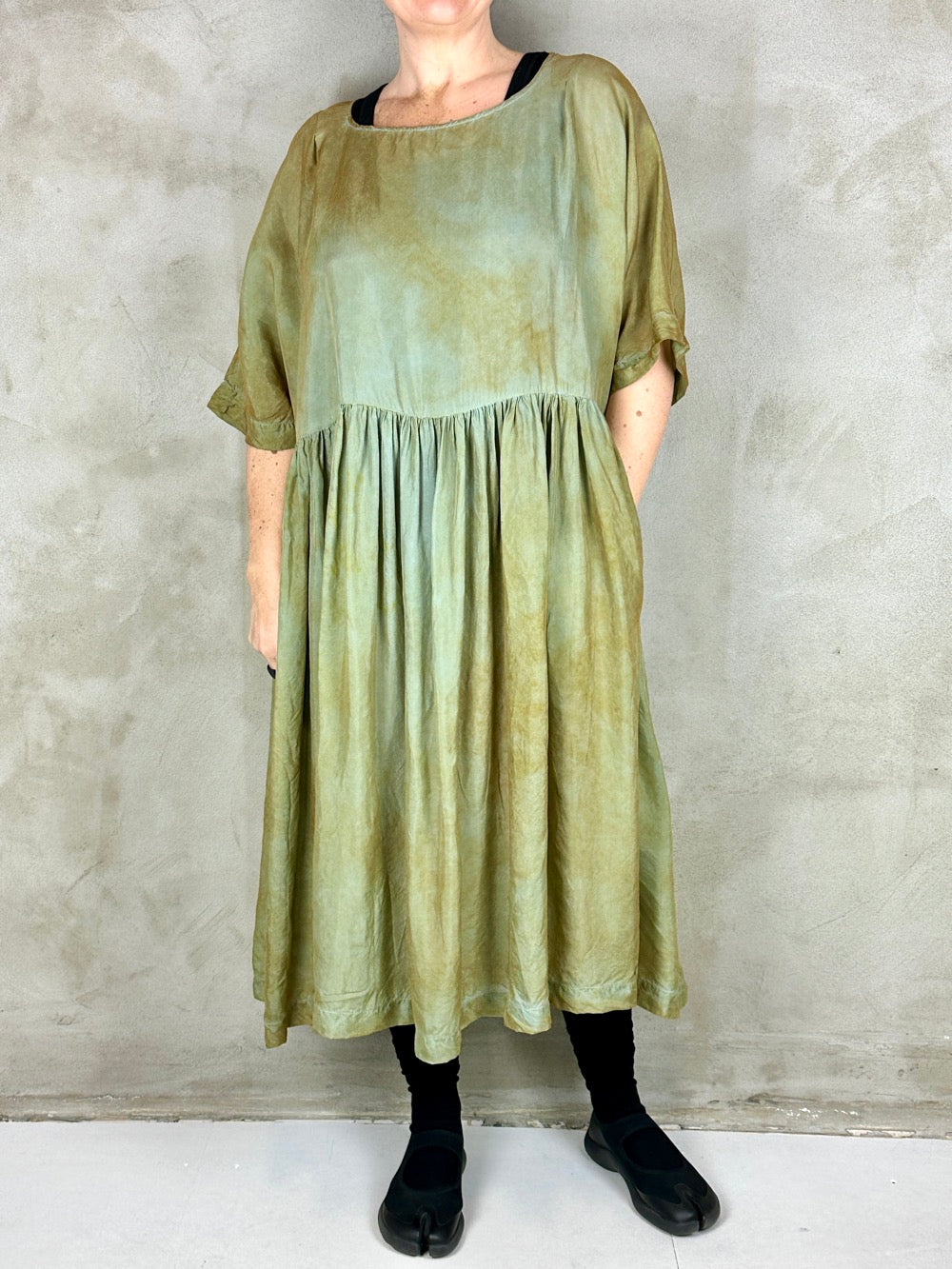 Oversize kjole med flot udskæring og perfekte ærmer. Kjolen har lommer og en længde som er god både med bare ben eller med et par leggings under. Det smukke stof changerer smukt i en bund af lys grøn med en orange overflade, hvilket også resulterer at alle kjoler er forskellige.