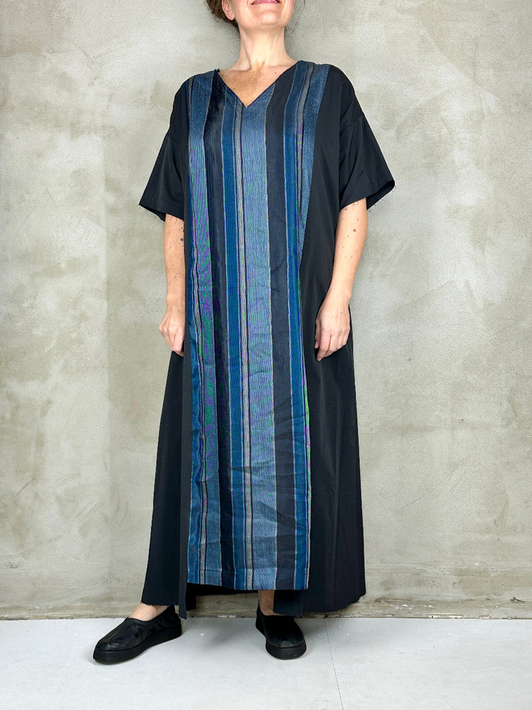 Lang oversize kjole med midterstykke i smukt vævet blå nuancer. Kjolen har v-udskæring og flot firkantet udskæring i nakken med knaplukning. De rå kanter går igen flere steder på kjolen og bryder det "pæne". Kjolen er asymmetrisk i længden og har brede korte ærmer. En fantastisk kjole som er meget Sydkoreansk i dens udtryk og meget SOH i dens perfekte udførsel.
