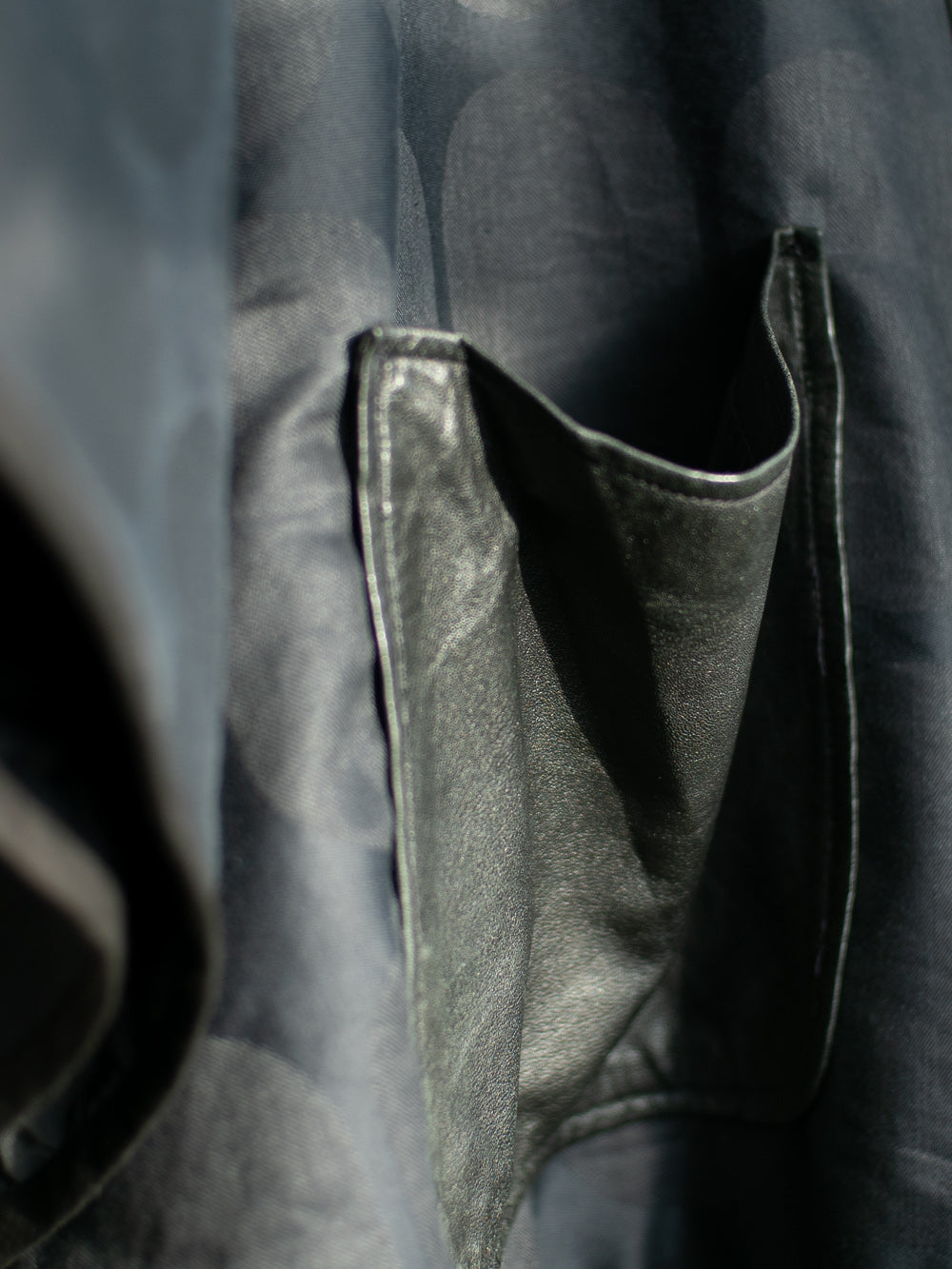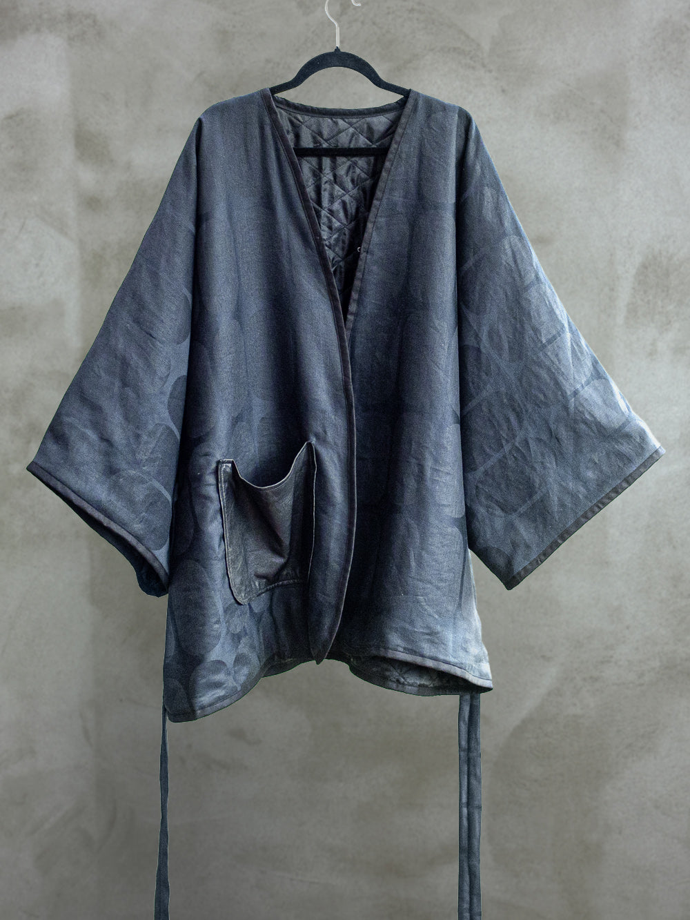 Halvlang kimono af upcycled bomuld/hør dug foret med quilted thermo. Lukkes foran med en hægte og bælte i samme bomuld/hør materiale. Bæltet sidder i trenser af skind, samme skind som lomme foran. Farven changerer mellem mørkeblå og sort.