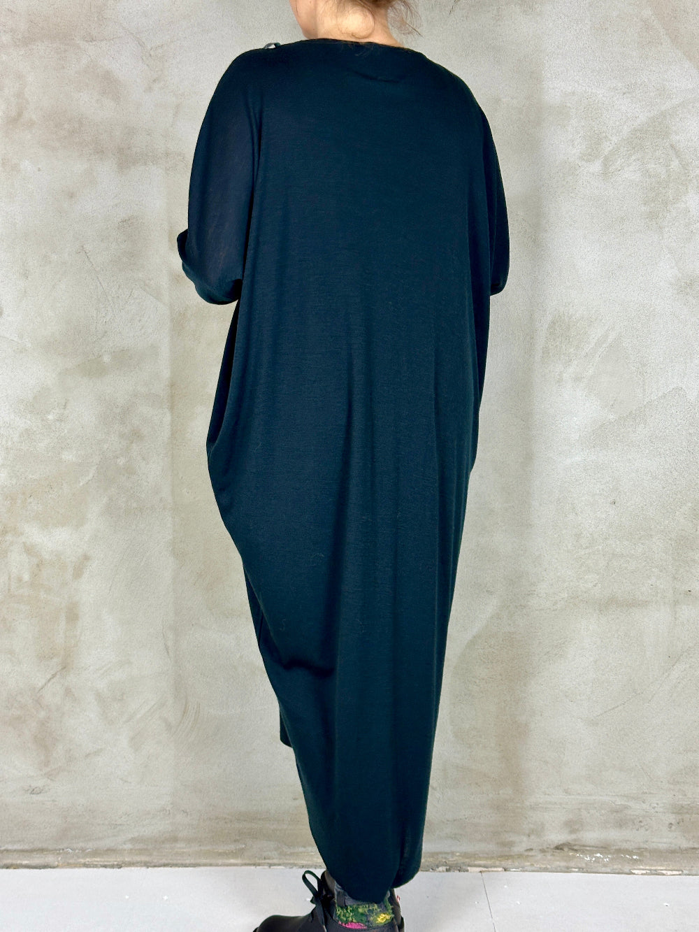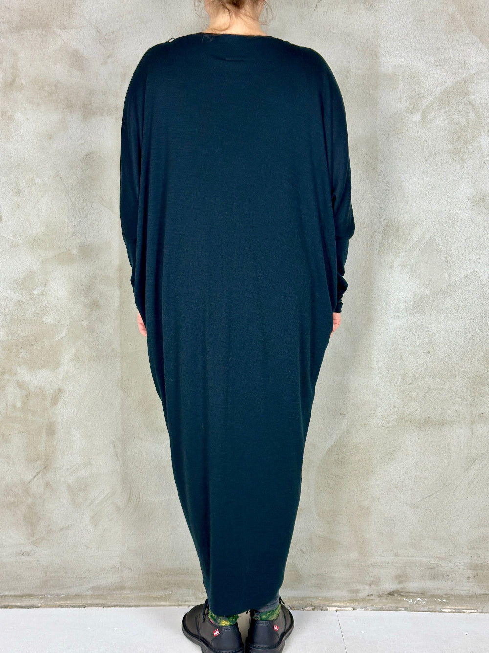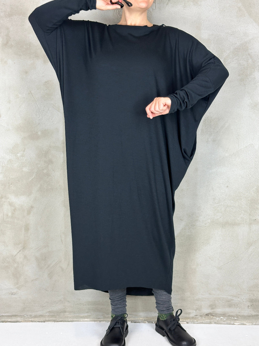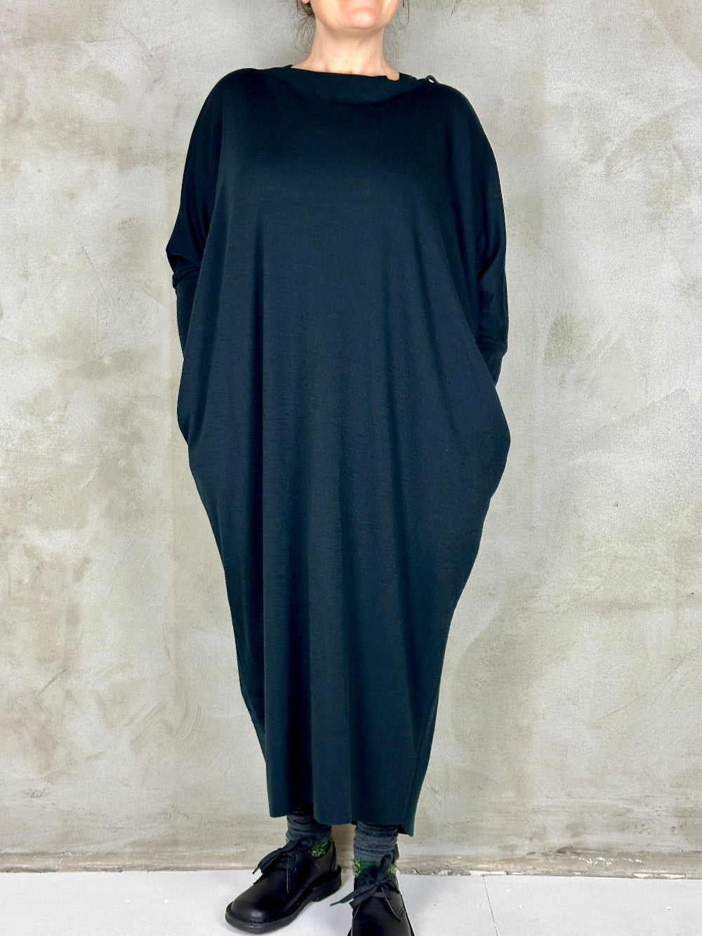 Fantastisk kjole i lækker tynd uld. Kjolen har en flot flagermus silhuet som draperer flot i siderne hvor der er gode lommer. Halsudskæringen er lige med et lille fald og afsluttes med Liselotte Hornstrups genkendelige læderdetalje. En yndlings kjole for mange, mig selv inklusiv, da den er minimalistisk med et twist, i en kvalitet som altid er skøn. Dette er en kjole man bare flytter ind i!