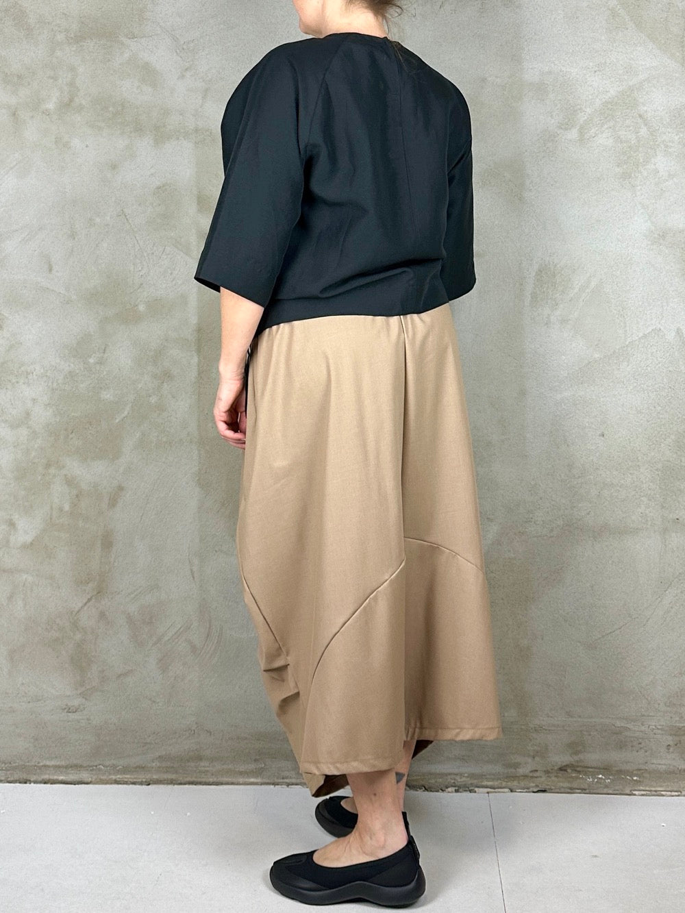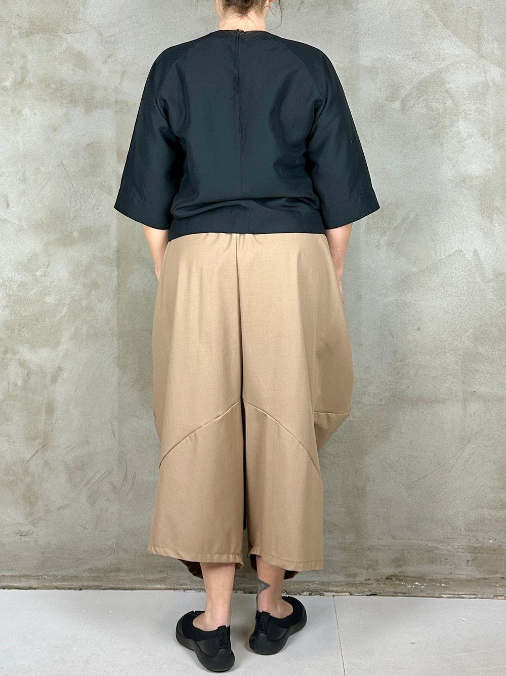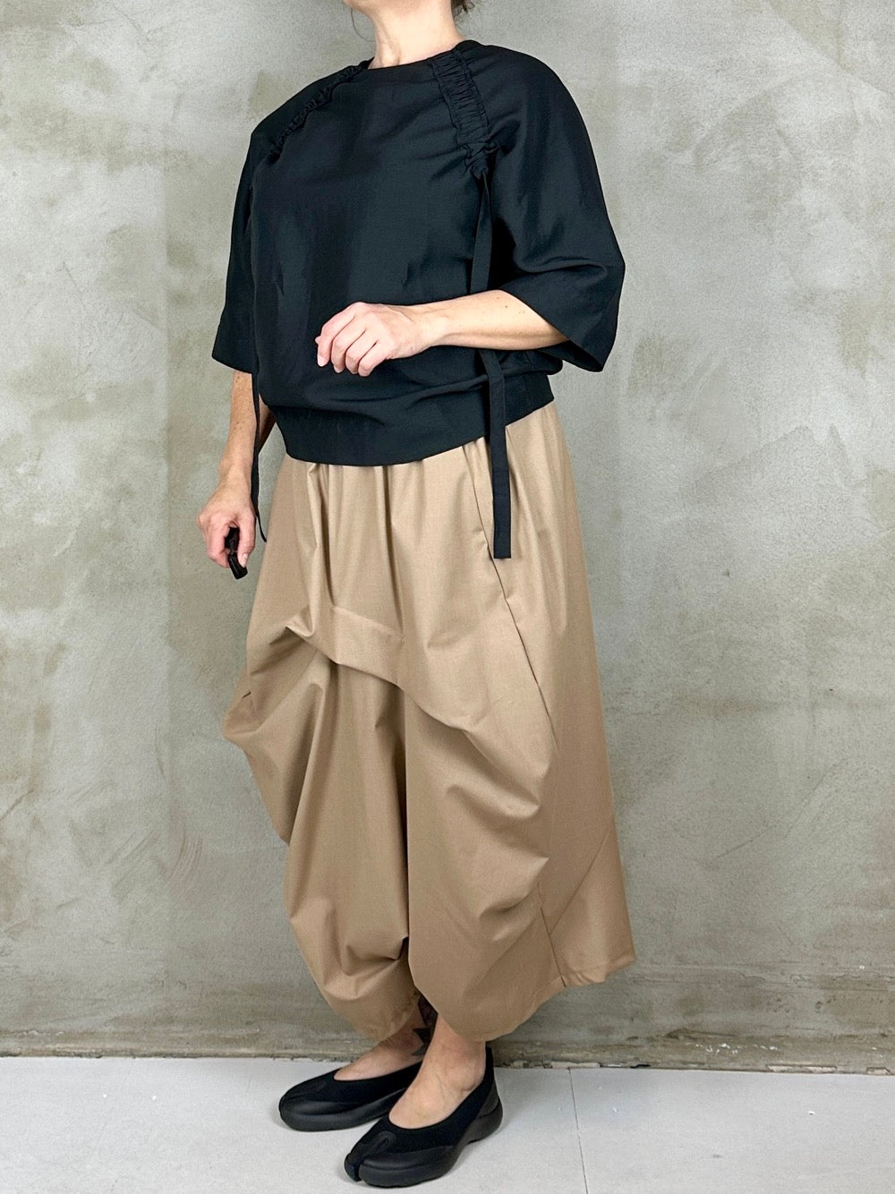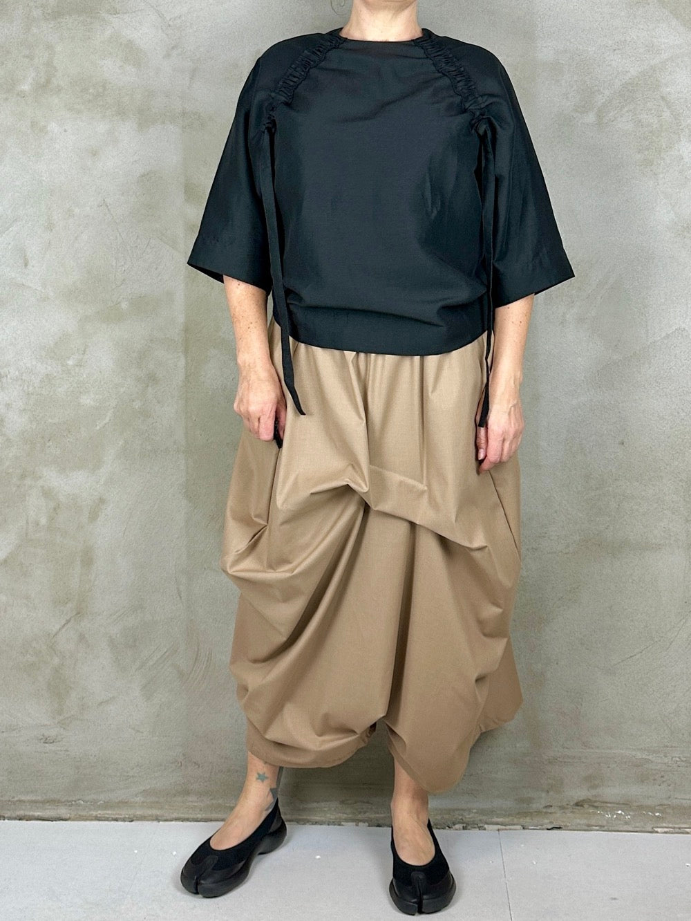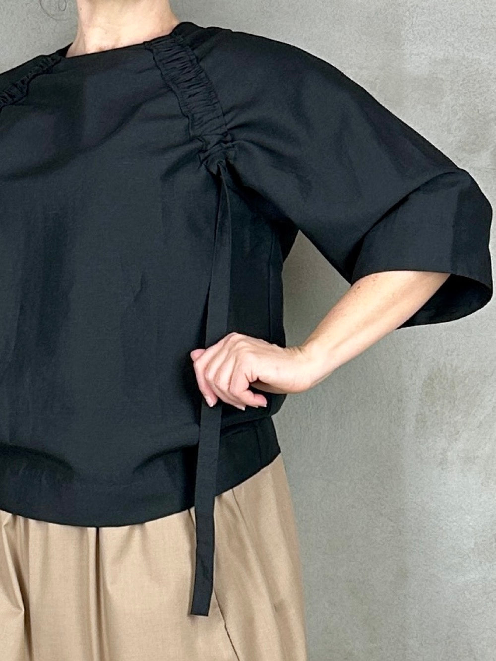 Lækker bluse med cool detalje i det smukkeste faste stof. Blusen har et albuelangt bredt ærme en loosefit pasform som kan sidde lidt forskelligt. Den har en påsyet rynket bånd som en flot detalje til det meget firkantet udtryk. Ønsker man mere rynket effekt kan man regulere med båndene som hænger.