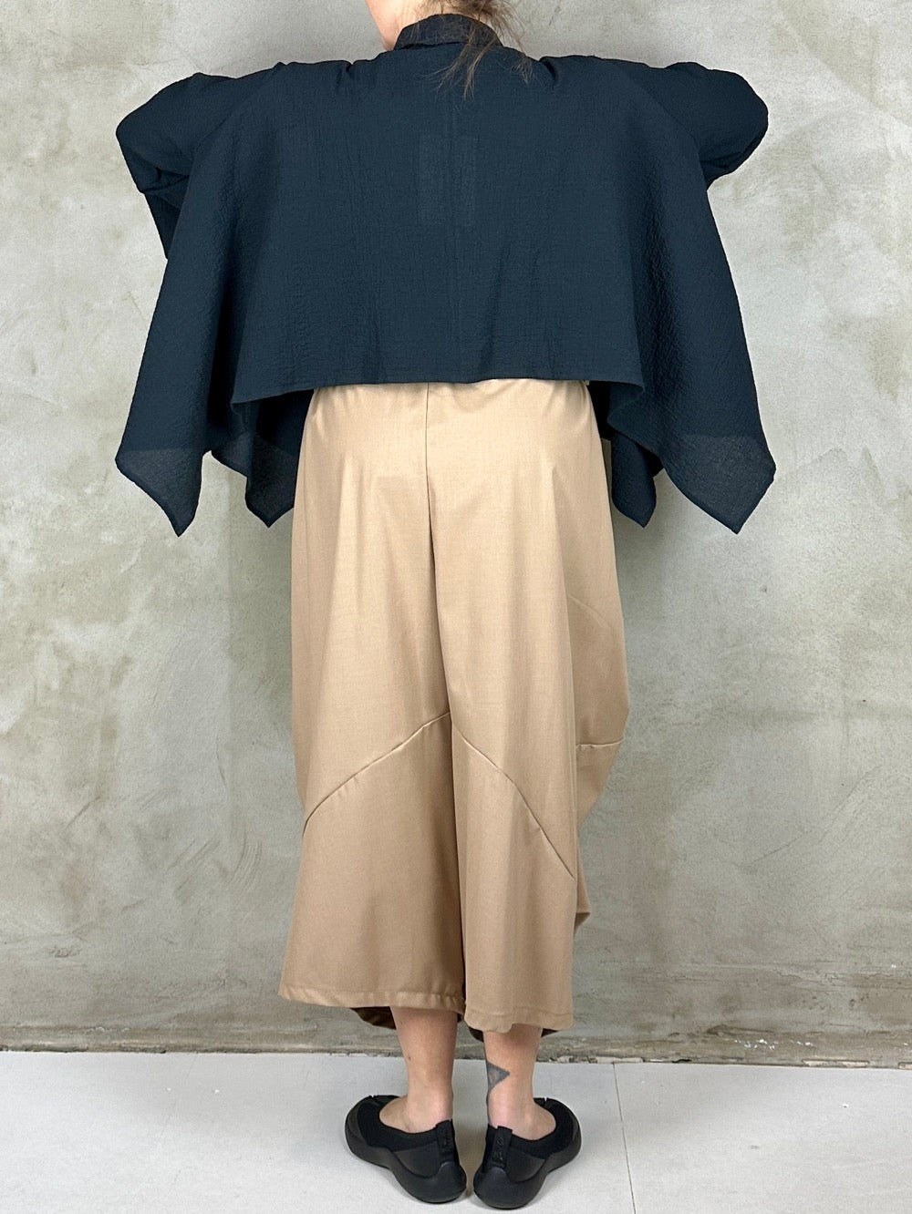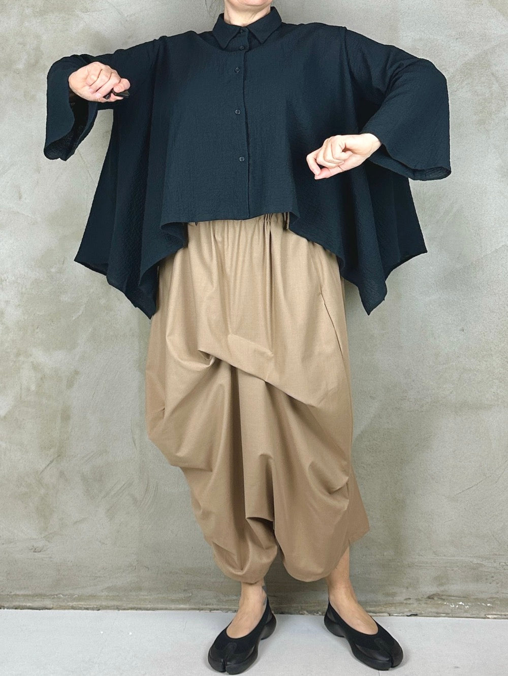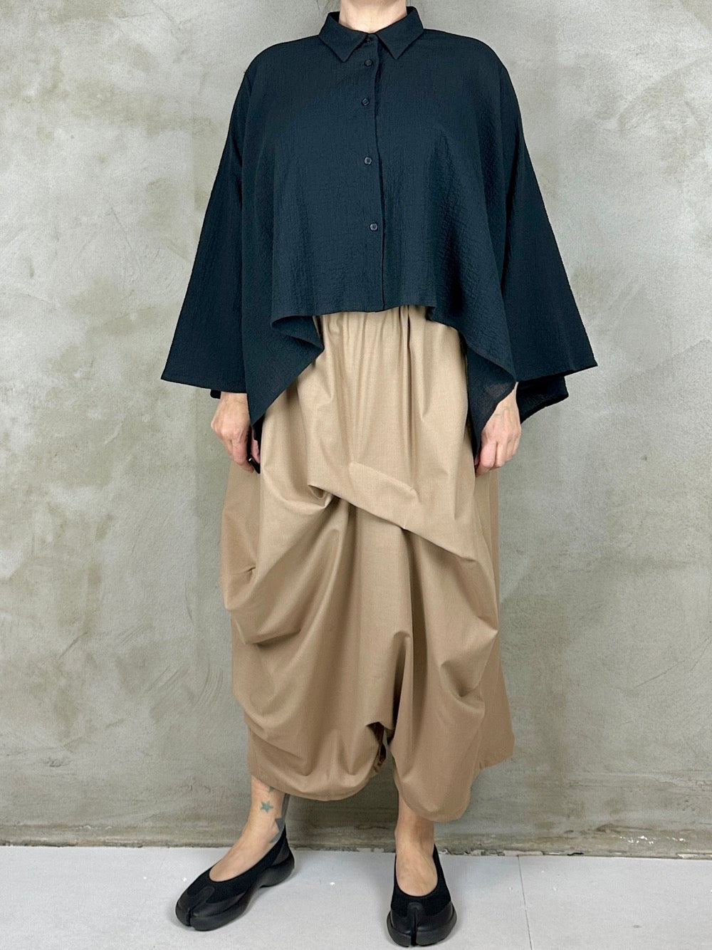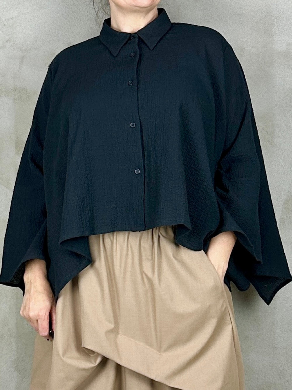 Let skjortebluse i vaflet bomuld. Blusen har et stumpet bredt ærme lille krave og er meget bred.