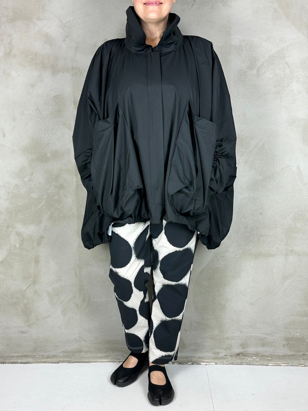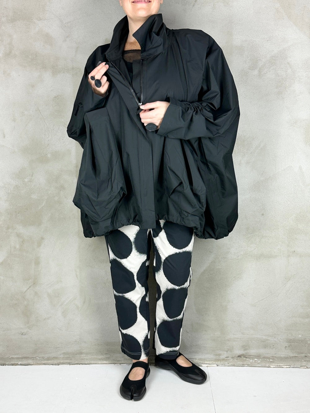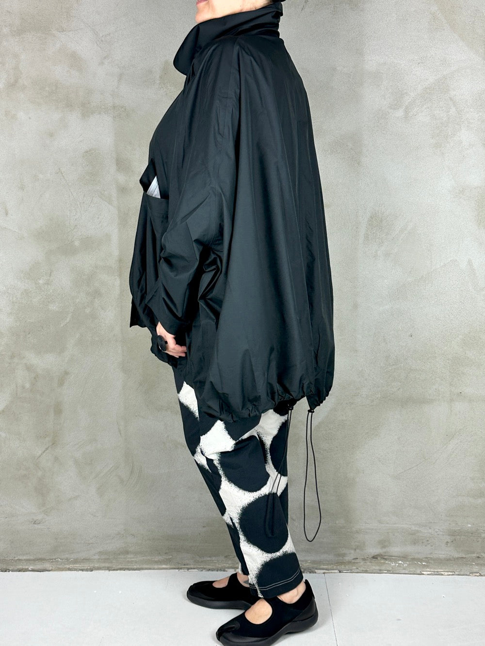 Fantastisk forårsjakke med kæmpe lommer og lukkes med lynlås. Jakken kan være helt bred eller trækkes ind forneden så den får en rund silhuet. En flot detalje ved ærmerne giver brugeren selv mulighed for at bestemme længden på ærmet og samtidig skabe en flot rynke effekt. Jakken er limet i syningerne så den kan bruges som regnjakke, hvilket gør den både cool og praktisk;)