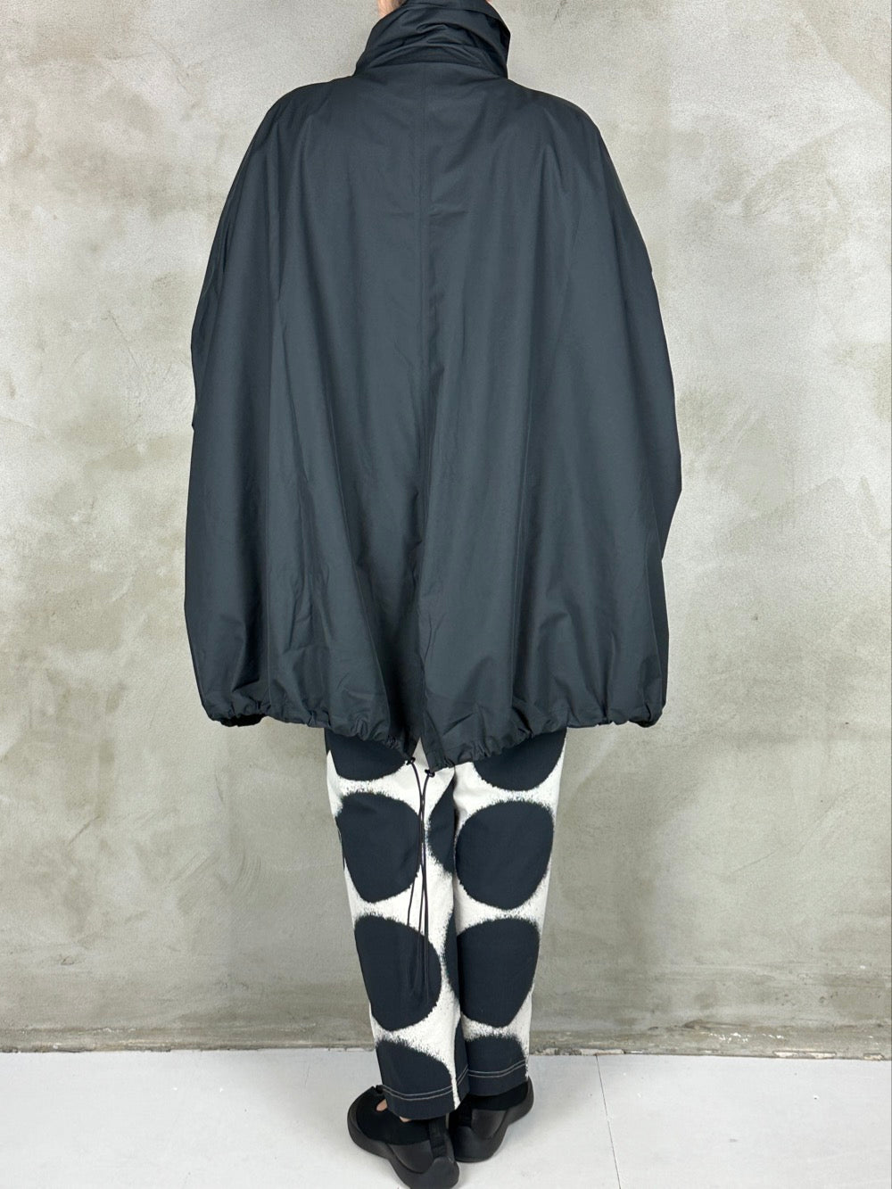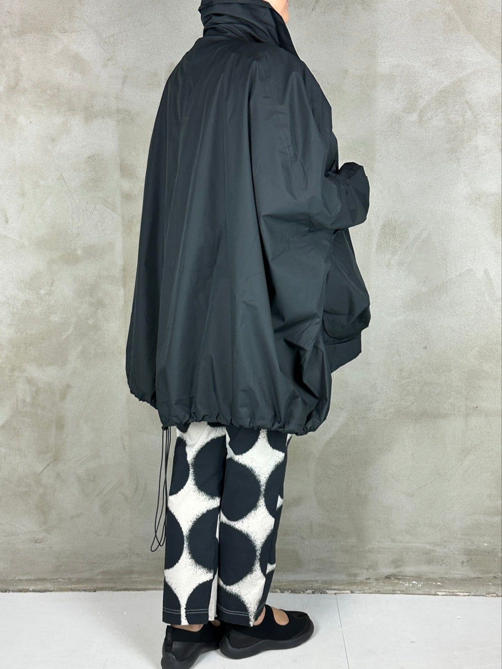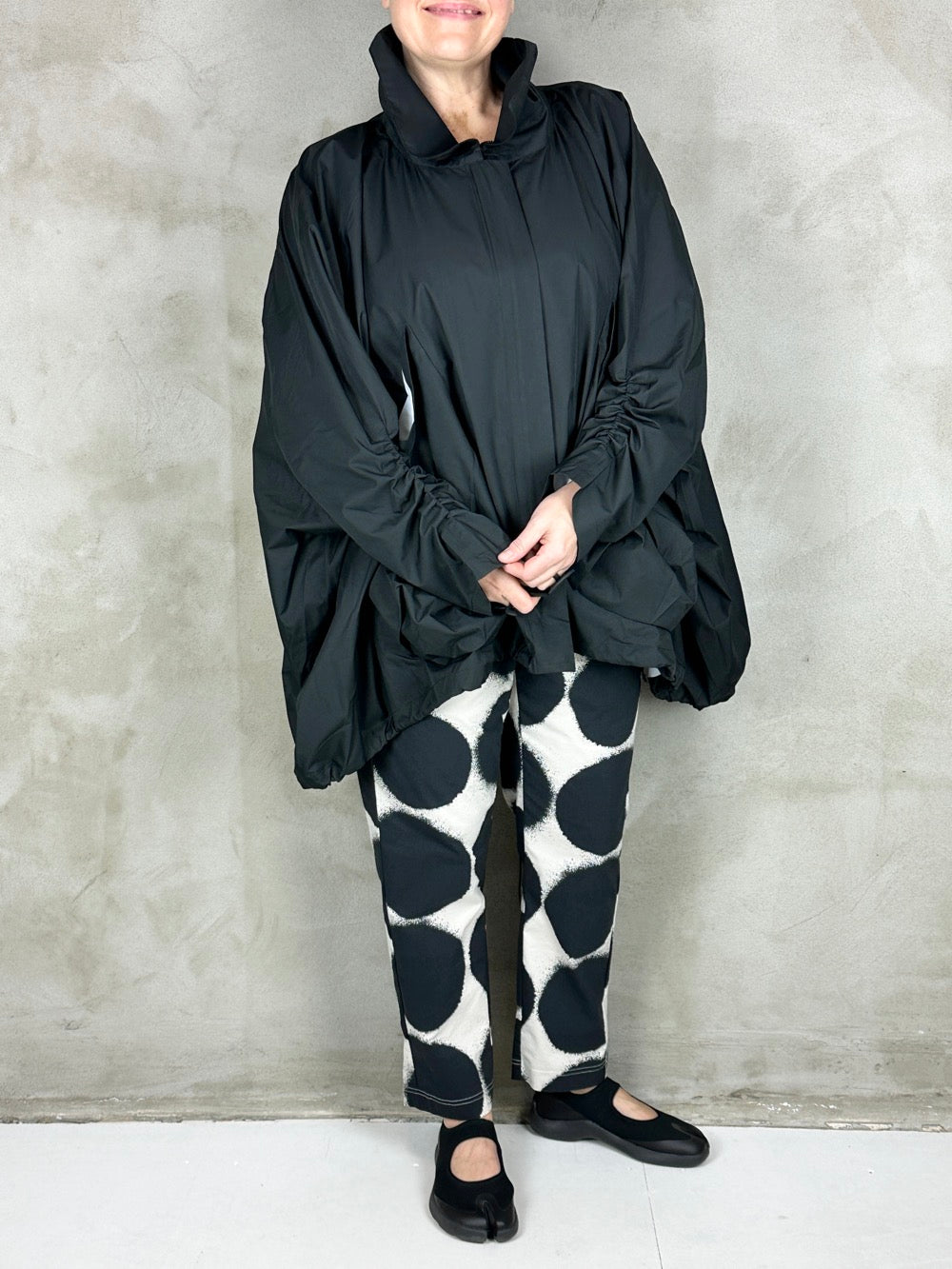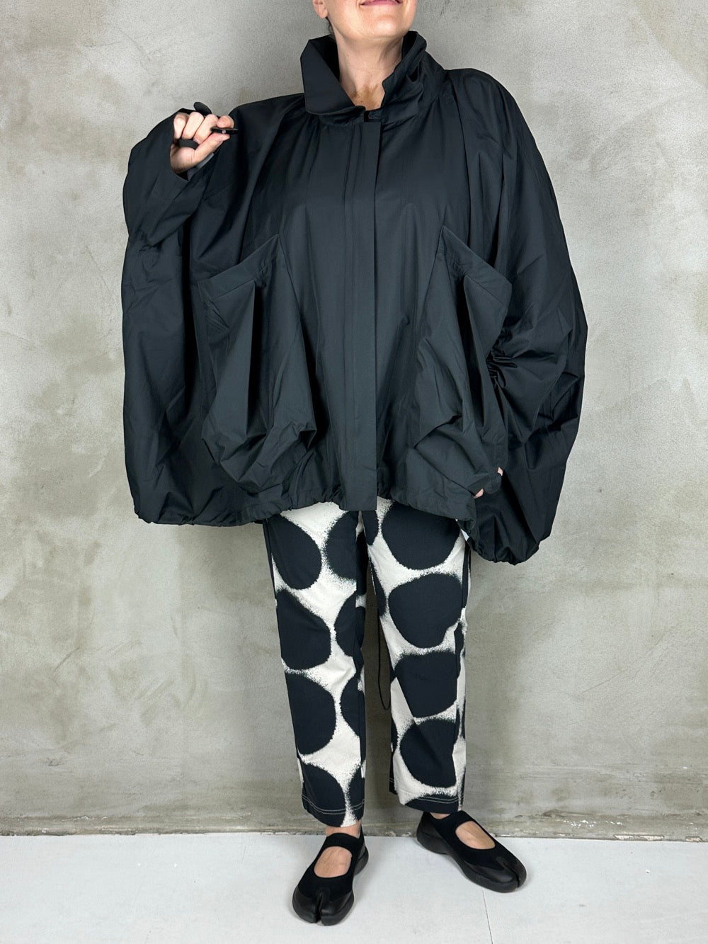 Fantastisk forårsjakke med kæmpe lommer og lukkes med lynlås. Jakken kan være helt bred eller trækkes ind forneden så den får en rund silhuet. En flot detalje ved ærmerne giver brugeren selv mulighed for at bestemme længden på ærmet og samtidig skabe en flot rynke effekt. Jakken er limet i syningerne så den kan bruges som regnjakke, hvilket gør den både cool og praktisk;)