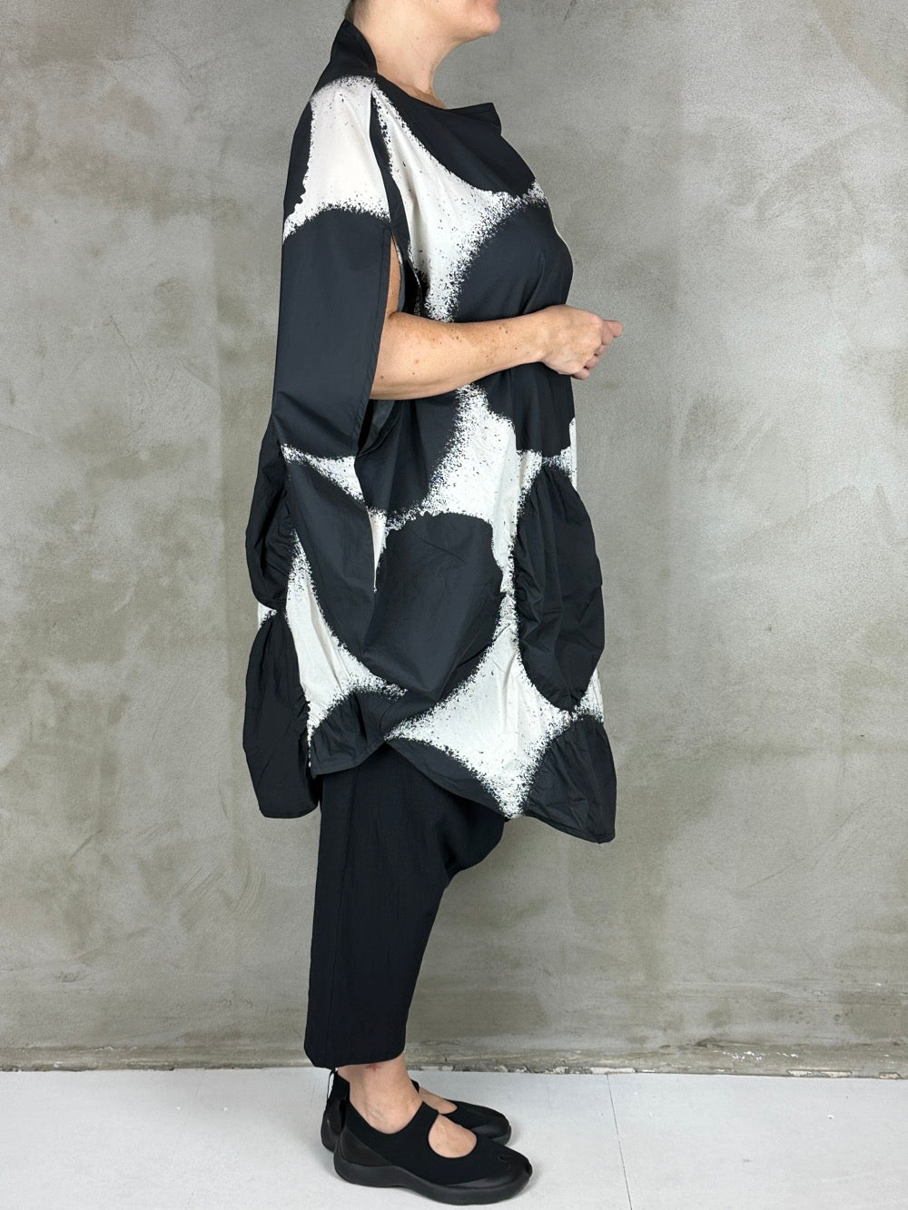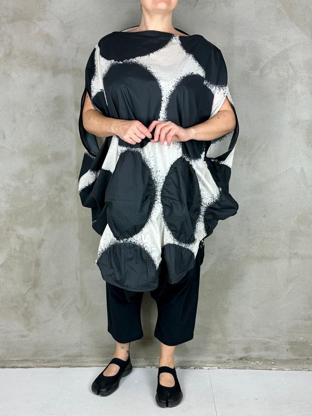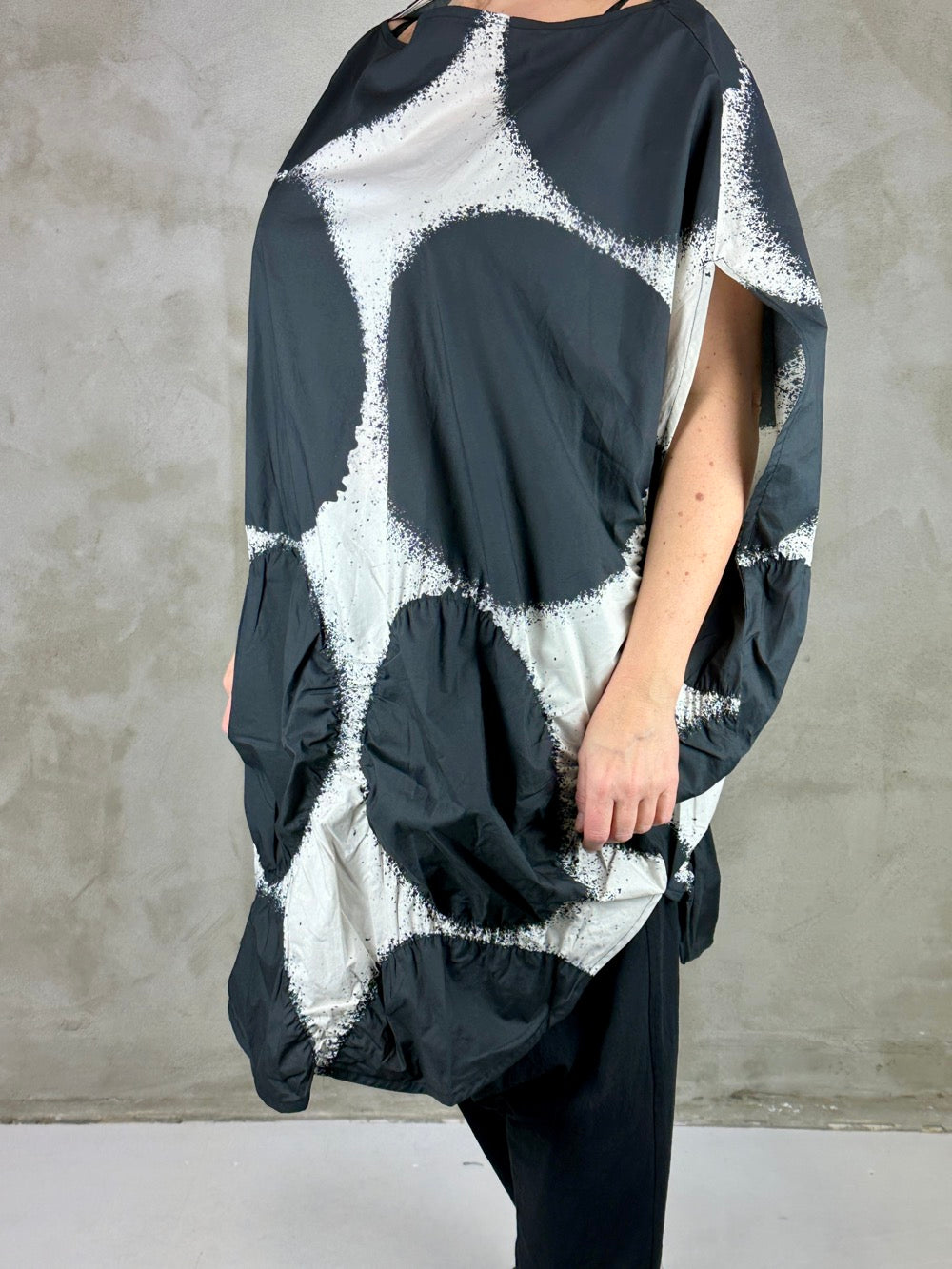 Flot grafisk kjole i en fantastisk lækker bomuld. Cirklerne i bunden af kjolen har på nogle af dem syet elastik rundt i kanten som giver dem en puffy 3D effekt, lækker detalje! Den runde silhuet giver et perfekt ærme og en flot lige udskæring. En kjole som er flot med en langærmet under, over et par bukser eller leggings og til bare ben til sommer.
