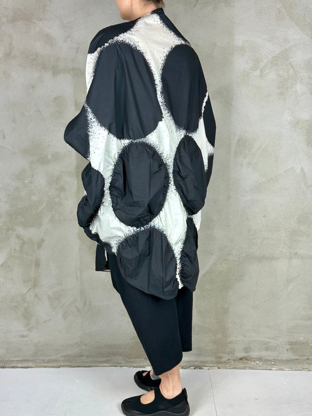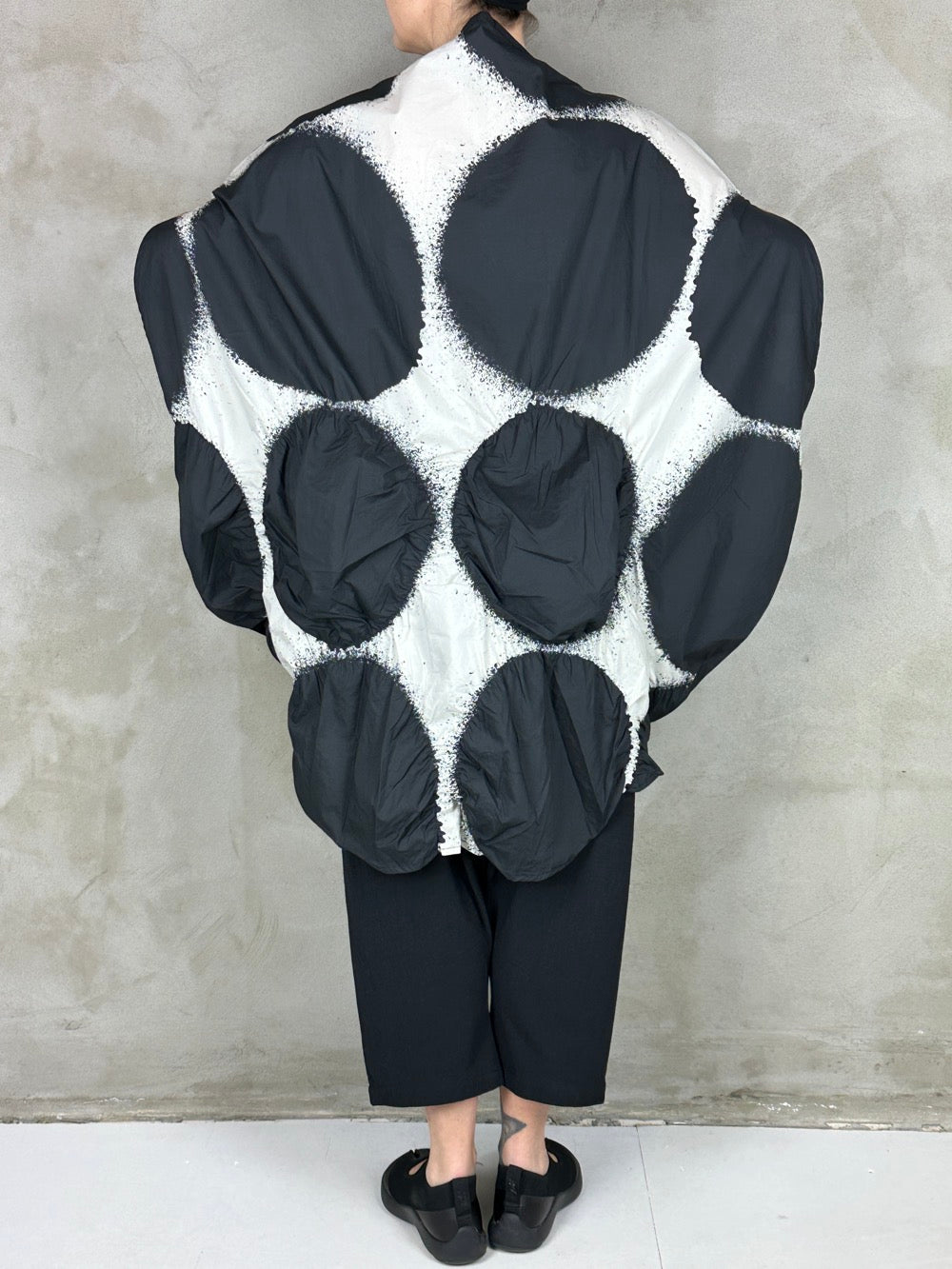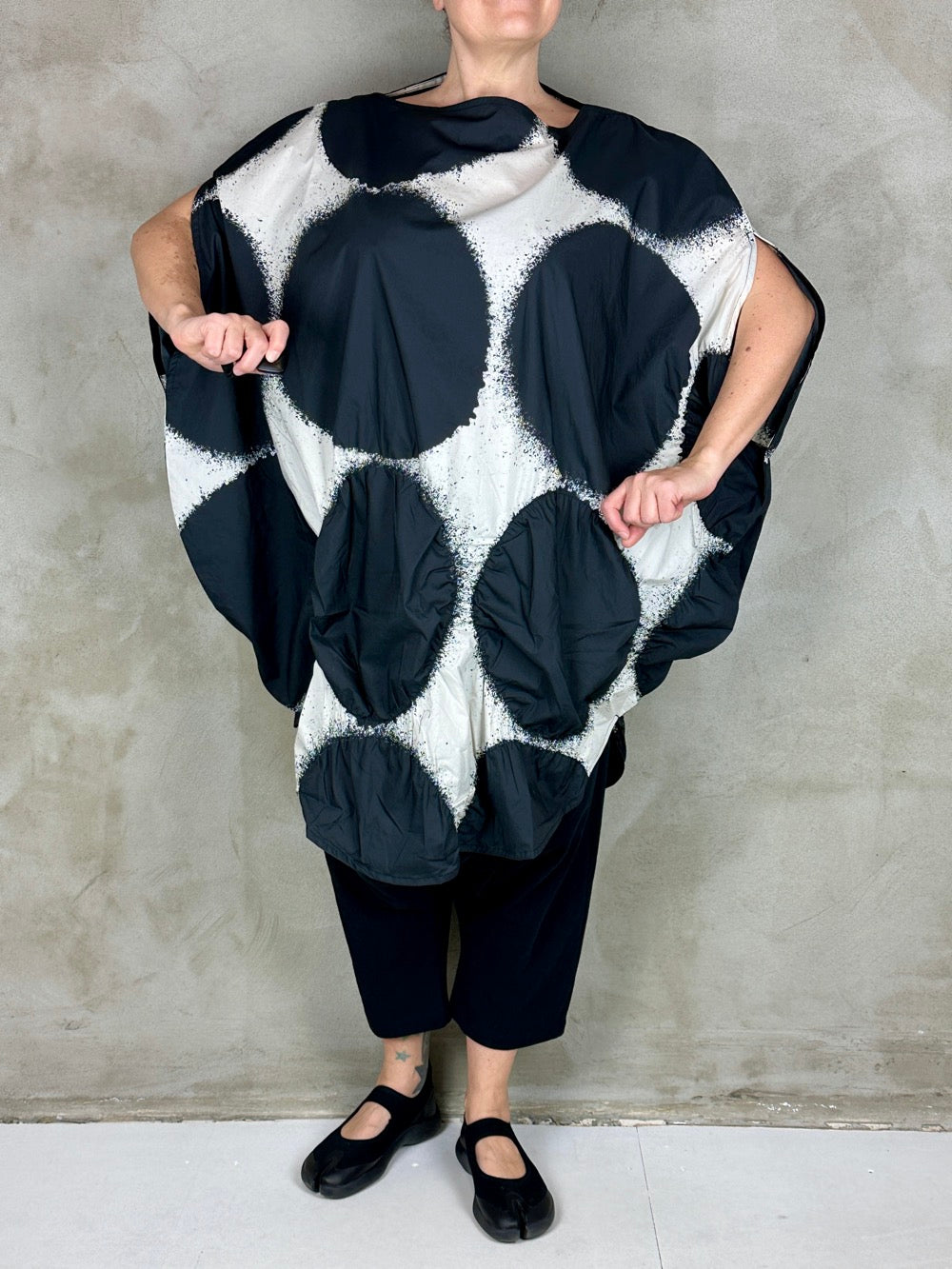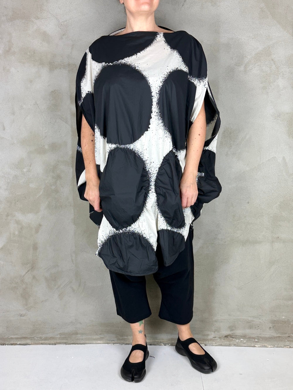 Flot grafisk kjole i en fantastisk lækker bomuld. Cirklerne i bunden af kjolen har på nogle af dem syet elastik rundt i kanten som giver dem en puffy 3D effekt, lækker detalje! Den runde silhuet giver et perfekt ærme og en flot lige udskæring. En kjole som er flot med en langærmet under, over et par bukser eller leggings og til bare ben til sommer.